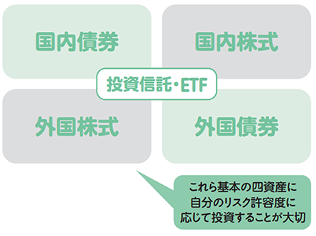 基本となる投資対象には「国内債券」、「国内株式」、「外国債券」、「外国株式」の4つがあります。投資先の分散をはかり、安定的な運用成績を目指すためには、この4つの資産に自分のリスク許容度に応じて投資することが重要です。これらの資産に投資する投資商品で初心者でも利用しやすいのは「投資信託」や「ETF(上場投資信託)」でしょう。