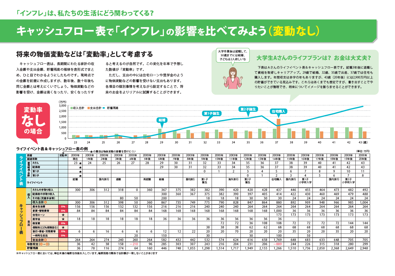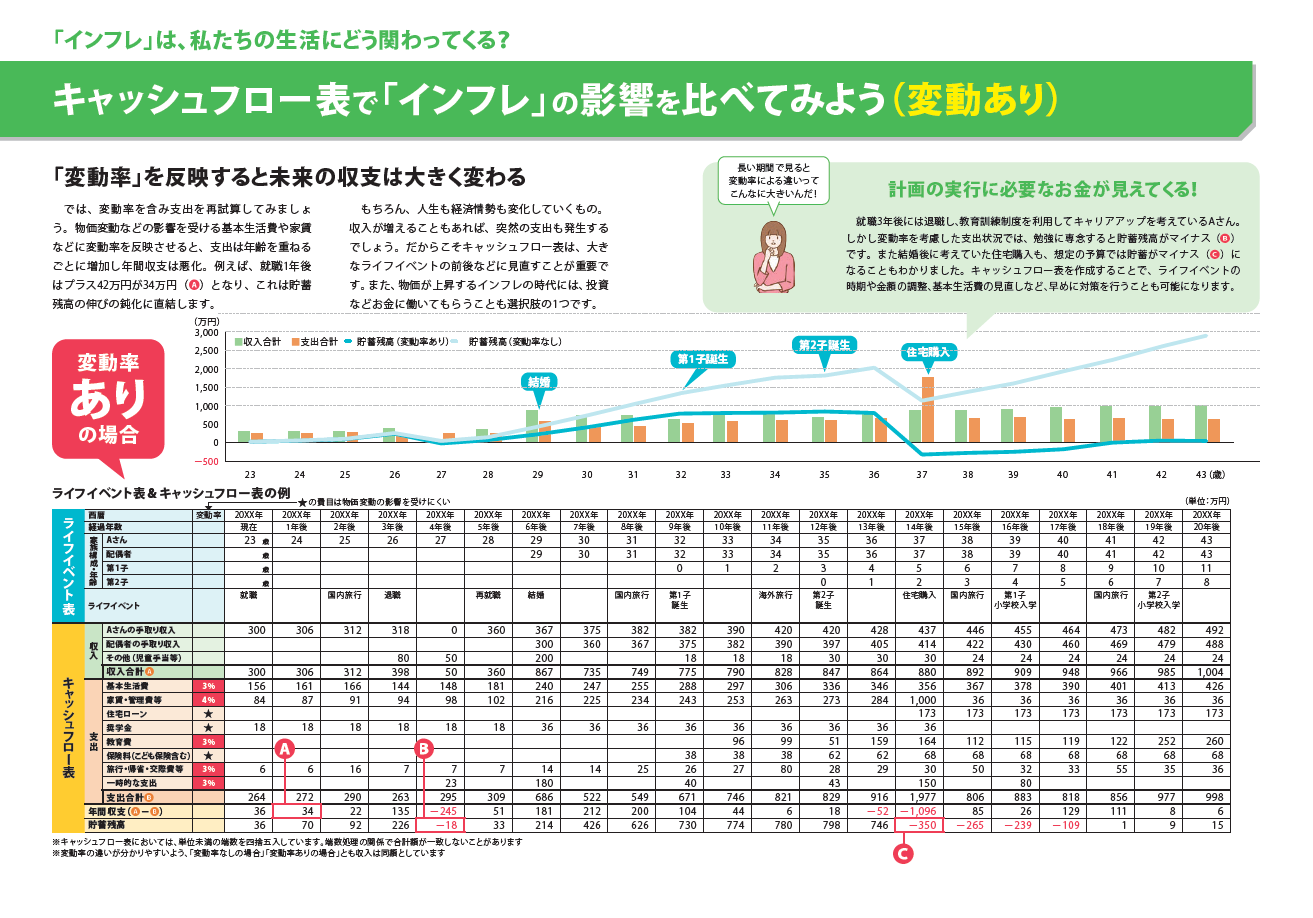 本書、PART2「3.ライフイベント表&キャッシュフロー表で未来を見てみよう!(P30-31)」では計算をしやすいよう、キャッシュフロー表の変動率をゼロとしていますが、インフレの影響を受けると将来の自分の収支・貯蓄はどう変わるのか。WEBコンテンツでは、変動率を加えたキャッシュフロー表も掲載し、違いを比較しやすくしています。