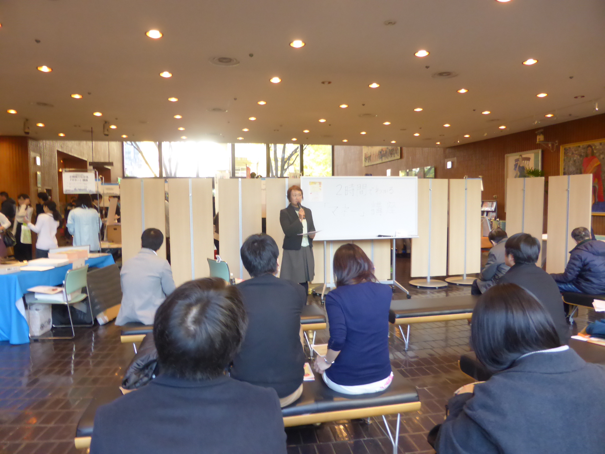 平成29年12月9日、新宿区が主催する「若者のつどい」が新宿文化センターで開かれ、日本FP協会東京支部は今年もこのイベントに参加しました。7回目になります。例年通り二部構成のセミナーとミニ相談会を行いましたが、新しい趣向を二つ付け加えました。一つは、会場を4階の会議室から1階ロビー奥のオープンスペースに移したこと、もう一つは最新のマネー知識を取り扱ったテーマに挑戦したことです。おかげさまで若者をはじめ多くの方に参加していただき、大成功のうちにイベントを終了することができました。