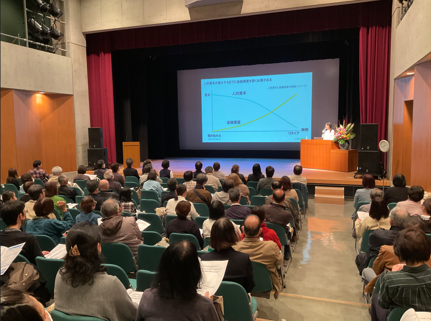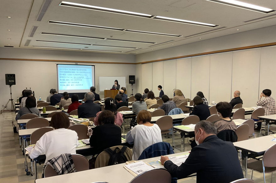 講演会に先立ち、午前中には地元FP(ファイナンシャル・プランナー)によるミニセミナー「50代から始める人生100年時代の家計戦略」を行い、角谷千映氏(AFP)が人生100年時代において重要となるシニアライフの過ごし方について、収支を予測しキャッシュフロー表を作成することをご紹介されました。