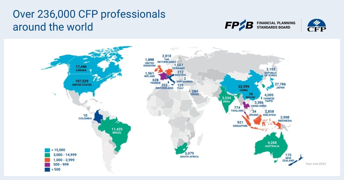 国際CFP®組織FPSB(Financial Planning Standards Board Ltd.)は、世界のCFP®認定者数が2025年も増加基調を維持し、年末には29カ国・地域で計236,300人に達したことを発表しました。前年比で5,652人の純増、増加率は2.5%となります。