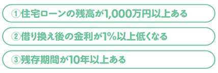 現在借りている住宅ローンの金利が高めな人、また今後適用金利が上がる人などは、住宅ローンを借り換えることによって、総返済額を減らしたり、毎月返済額を抑えたりできる可能性があります。借り換えする際は、別の金融機関から現在の住宅ローン残高に相当するお金を借り入れ、返済に充てることになります。借り換えには様々な手数料がかかるため、手数料を差し引いても負担軽減効果が見込めることが、借り換えるときの条件です。どのような住宅ローンに借り換えるべきかは人によって異なります。右の図にある三つの条件に当てはまる人は、具体的に検討してみるとよいでしょう。