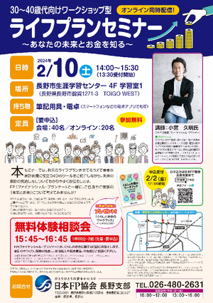 ・イベントが中止又は一部変更される場合は、日本FP協会長野支部のホームページにてご案内いたします。