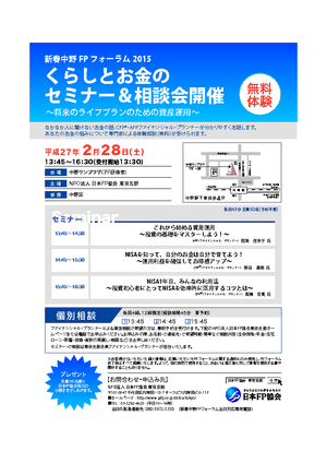 ファイナンシャル・プランナーは皆さまのライフプランをふまえた長期的視点で様々なプランを提案し、夢や目標の実現をサポートする人生設計の総合アドバイザーです。皆さまにとって関心があること、また不安に感じていることなど実際に相談できます。事前にお申込みの際、お名前・ご連絡先・ご希望時間・簡単なご相談内容をお申出ください。個人情報やご相談内容に関する情報は秘密厳守いたします。相談員には、相談者の連絡先は告知しません。