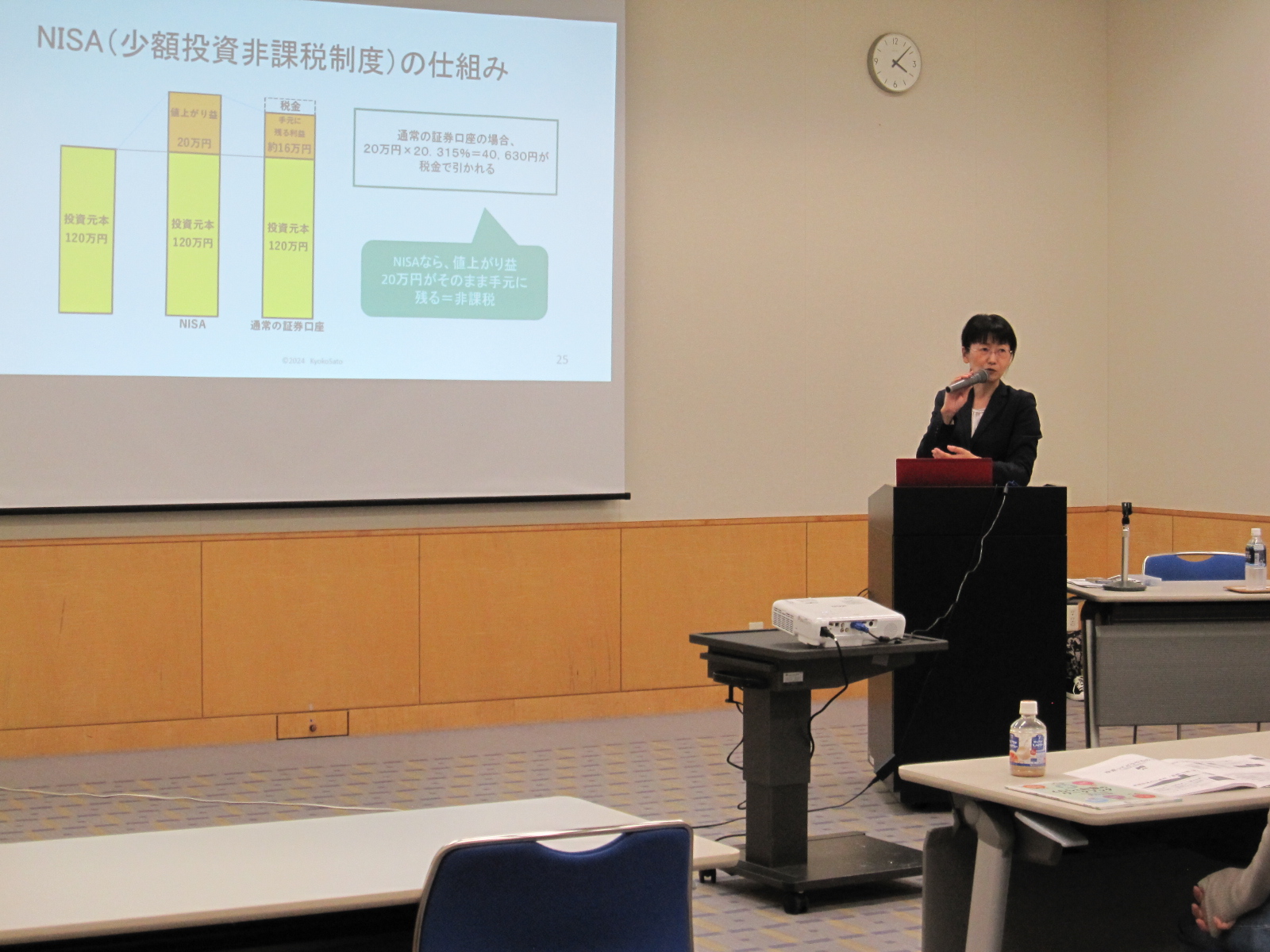 資産形成はじめの一歩〜幸せ未来を実現しよう〜をテーマにライフスタイルの多様化から参加者各自の「幸せ未来」とは何なのか?を提起し、その実現のためにはライフプラン表やキャッシュフロー表を有効活用することについて講演。お金の使い方を考えることは生き方を考えること。時代の変化が激しく、価値観も多様化している現在、 自分だけの「幸せ未来」を考えることも重要。 ライフプランを作成して、ライフイベントに必要な金額を把握すること。必要なお金は、社会保険や公的制度、会社の制度も十分活用して。 投資は必ずしも必要ではないが、少子高齢化・インフレへの理解、対策をとること。 投資をするなら「長期・分散・積立」ができるNISAや目的に応じて使い分けようといった内容で実施しました。