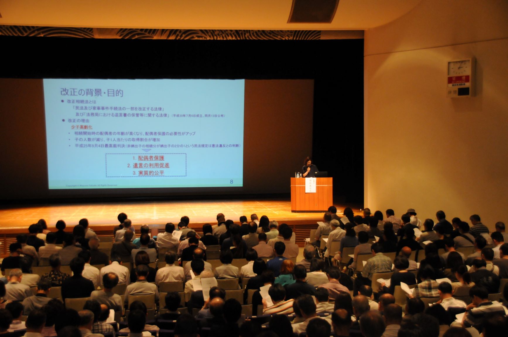 福田氏には税理士というお立場から相続税の民法改正についてお話しいただきました。「新しい相続法」の項目では「遺留分」「遺産分割」「遺言」「配偶者の居住の権利」「特別の寄与」について説明され、最後に「近年の相続税の改正事項」では「小規模宅地等の特例の概要」や「貸付事業用」の対応などご紹介していただきました。セミナー参加者419名。 -